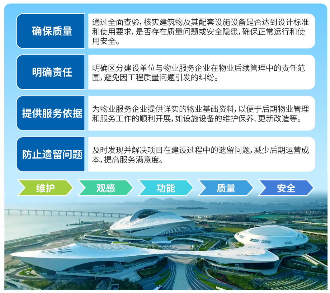 佳保安全围绕维护、观感、功能、质量、安全五大核心维度,制定标准化全业态查验体系,对项目开展 100% 全覆盖承接查验,全面核验项目建筑本体及配套设施设备的建设质量、功能完整性与安全合规性,圆满完成项目高标准承接查验任务,为项目后续平稳、安全、高效运营奠定了坚实基础。
