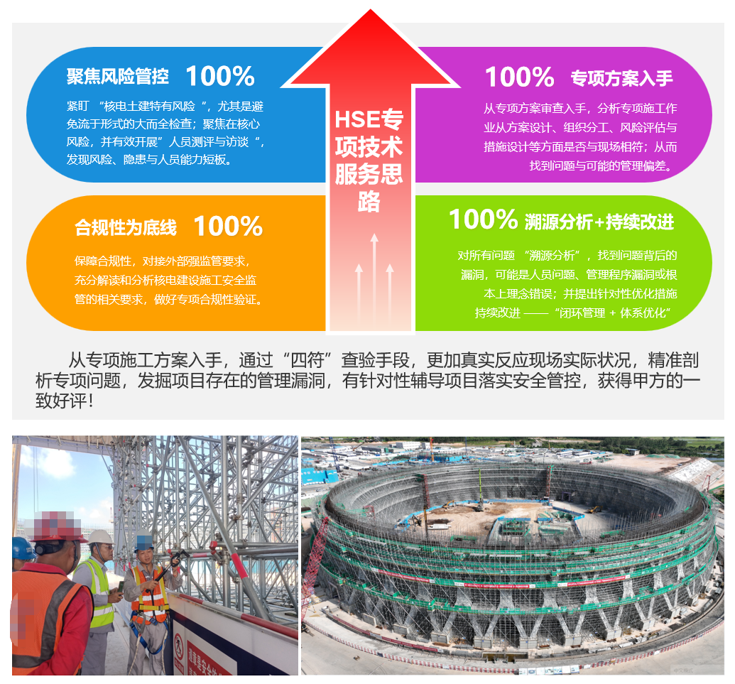 佳保安全受客户委托,聚焦核电工程项目建设全周期专业化安全监管需求,为客户提供全维度、穿透式的安全技术专项服务,针对各建设项目不同施工阶段的核心施工工艺,开展全专业安全专项检查与管理体系优化辅导,助力客户补齐安全管理短板,强化重大风险精准管控能力,全面落实核电工程建设安全生产主体责任,筑牢核电工程安全管控防线。