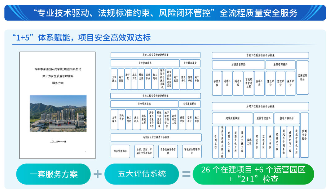 本项目覆盖房建、市政配套、运营园区多个业务领域,项目体量大、业态多、场景复杂,安全质量全流程管控难度高,需要全流程第三方安全质量驻场管控服务。佳保安全针对客户房建、市政配套、运营园区三大核心板块,定制打造 “1 套总服务方案 + 5 套专业巡查体系”,服务当前覆盖 26 个在建项目与 6 个运营园区,峰值覆盖超 40 个项目;创新建立 “每月 2 次全覆盖 + 1 次专项 / 节前飞行检查” 的常态化管控机制,实现全场景安全质量隐患的闭环管理;同步落地属地化服务办事处,为客户提供一站式、全天候的安全生产技术赋能,全力保障项目建设与园区运营的安全平稳推进。