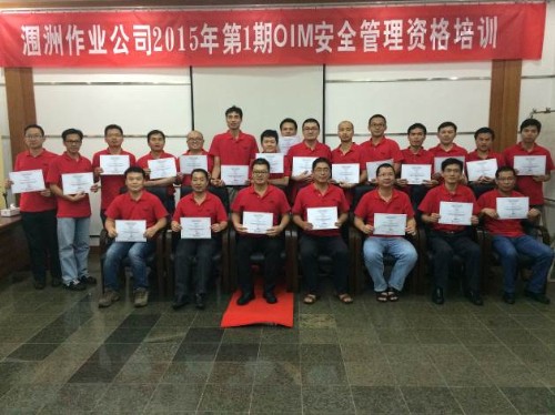 2015年5月11日-16日,佳保安全培训团队组织了为期5天的第1期OIM培训课程,参加培训人员主要包括某作业公司油田总监、安全监督、生产监督、平台长等;培训内容主要包括企业安全文化建设、OIM及其职权、应急管理与应急处置、承包商管理、作业控制、典型事故案例分析等。