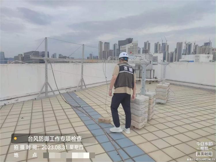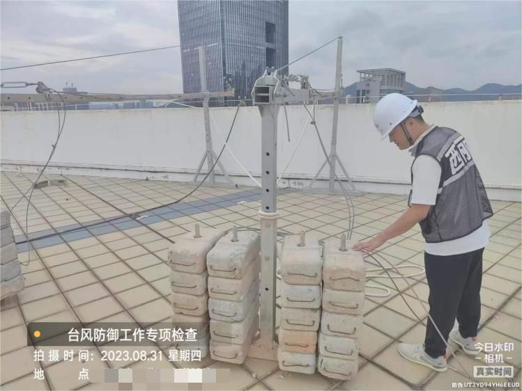 ▲台风前驻场工程师对西丽街道大楼外墙小散工程项目的吊篮支撑架及配重块进行防御工作专项检查